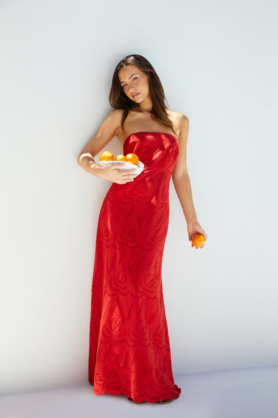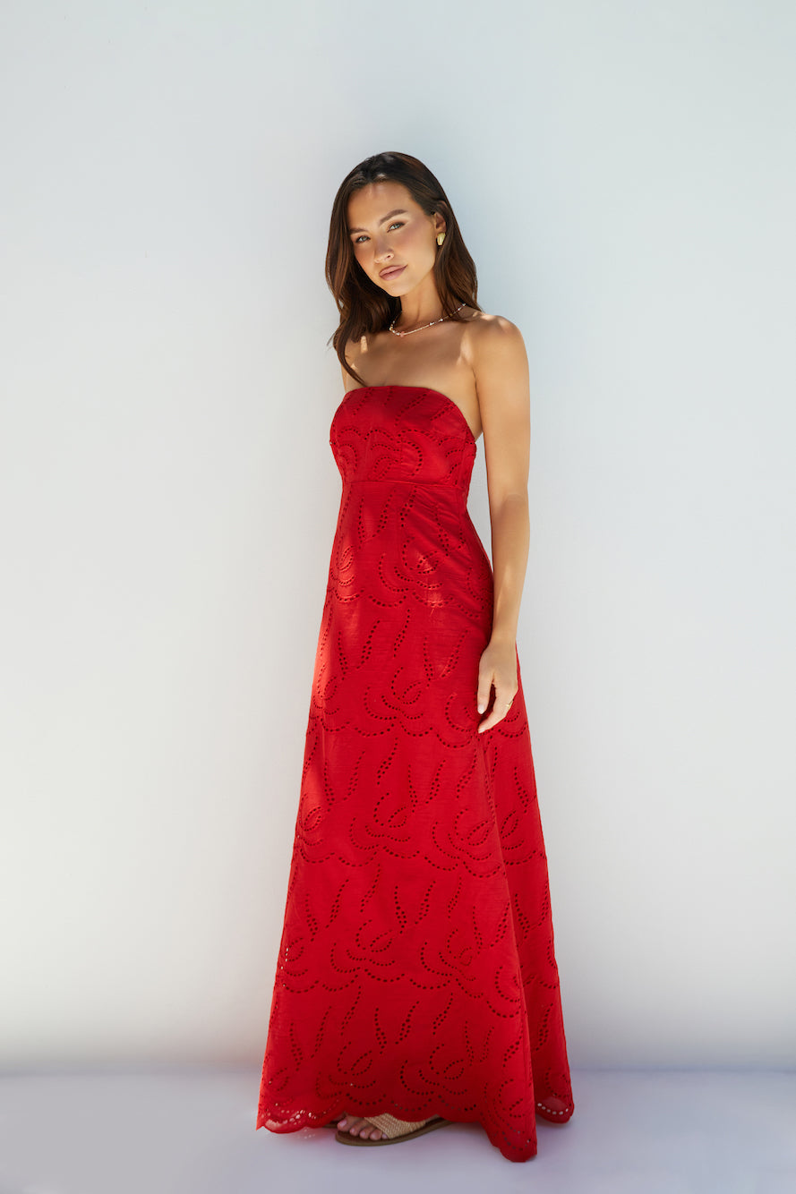 The Riviera Rouge Strapless Maxi Dress embodies effortless elegance and timeless allure, making it a standout choice for any festive occasion. Crafted in a striking red hue, this strapless maxi dress showcases intricate broderie anglaise detailing, offering a graceful and romantic silhouette.